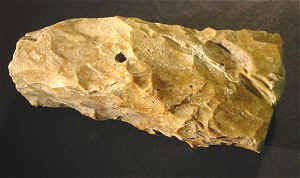 colored flint. All sides are roughly flaked. This type of axe was used for a variety of uses including