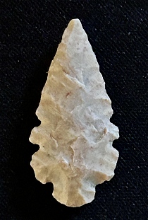tan colored chert with some darker striping. This point has a spear shape and measuring